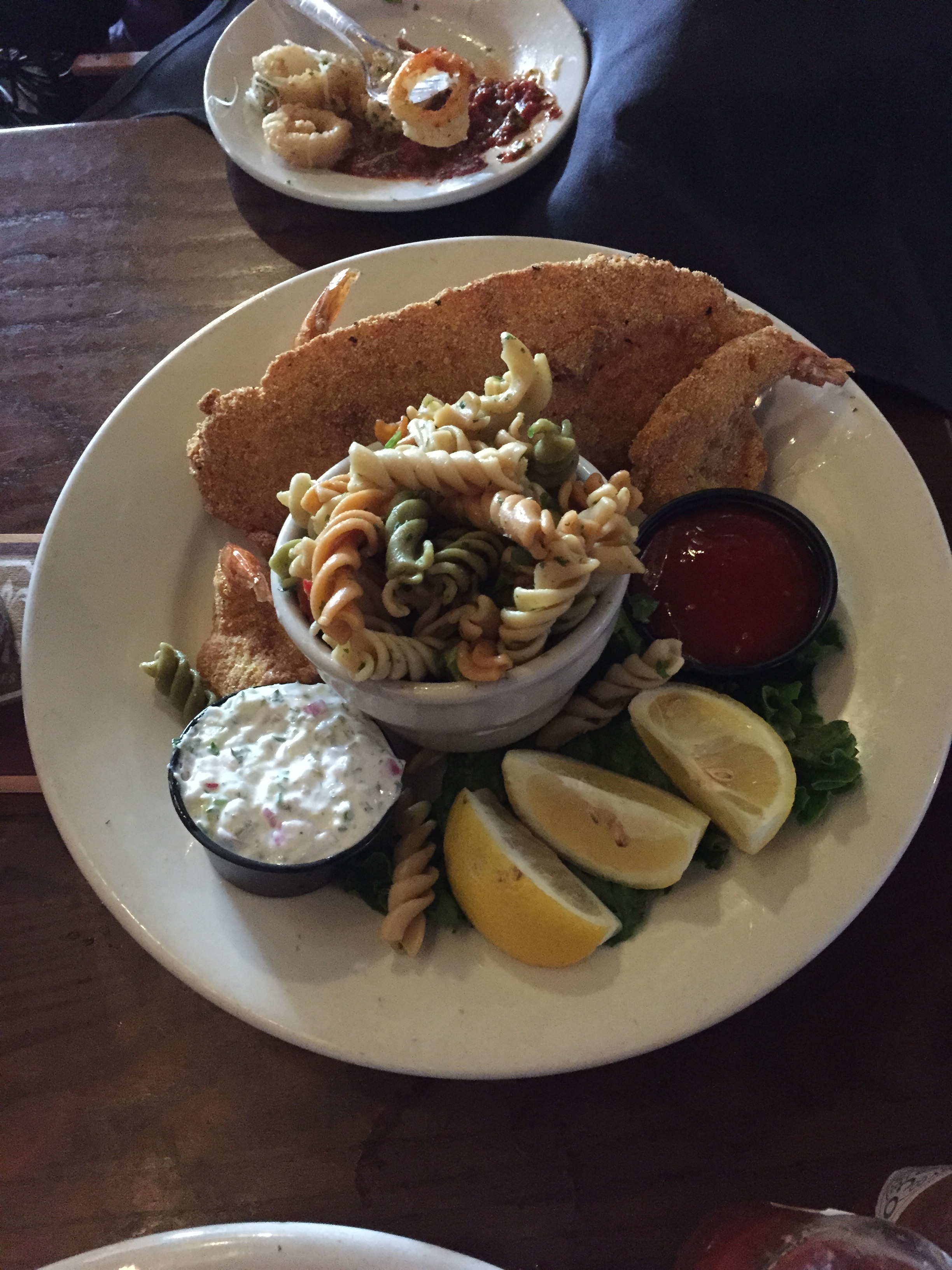 I usually get penne with red clam sauce (highly recommend it), but I decided to get something different this time. I went with the F. B. Combo (catfish fillet and shrimp) with pasta salad instead of fries. The fish and shrimp were crunchy on the outside and tender on the inside. The breading wasn’t salty, but seasoned nicely. And the pasta salad… I normally don’t like pasta salad, but I figured I’d give it a shot. It was actually pretty yummy! I was impressed.