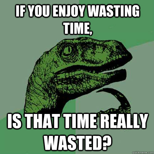 I both agree and disagree with this statement. Most of the time, I don’t really feel like I’ve wasted my time if I enjoy something, unless it eats away more time than it really should. Reading doesn’t count, because it’s actually work. At least that’s what I keep telling myself as I binge read webtoons/manga/manhwa. Okay, that’s not technically work, but it gives me stuff to think about when I can’t sleep, instead of having my brain home in on every stupid mistake I’ve ever made. Crocheting or drawing never really feels like wastes, because there’s actual proof that my time has been productive. Even just staring into space and thinking doesn’t feel like a waste of time, because that’s what writers do. It’s weird. But as long as it feels productive (even if it isn’t), I don’t feel like I’ve wasted time.