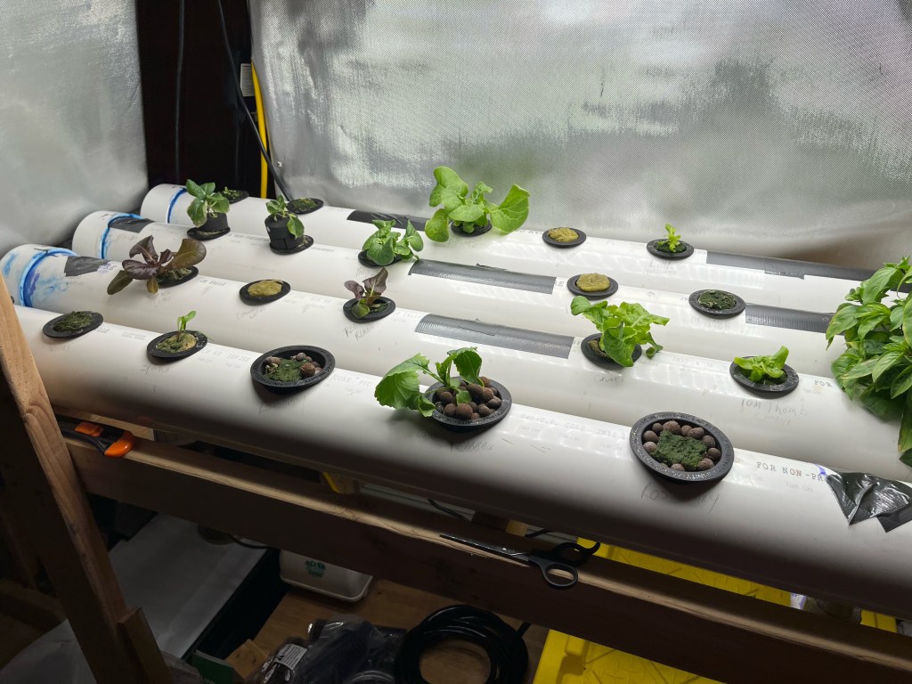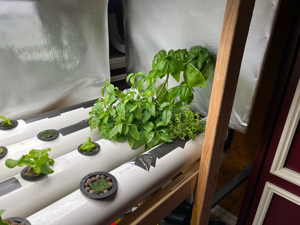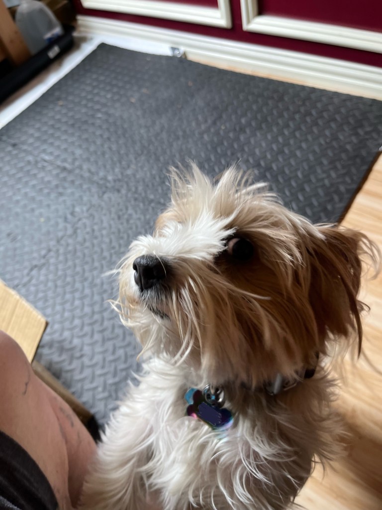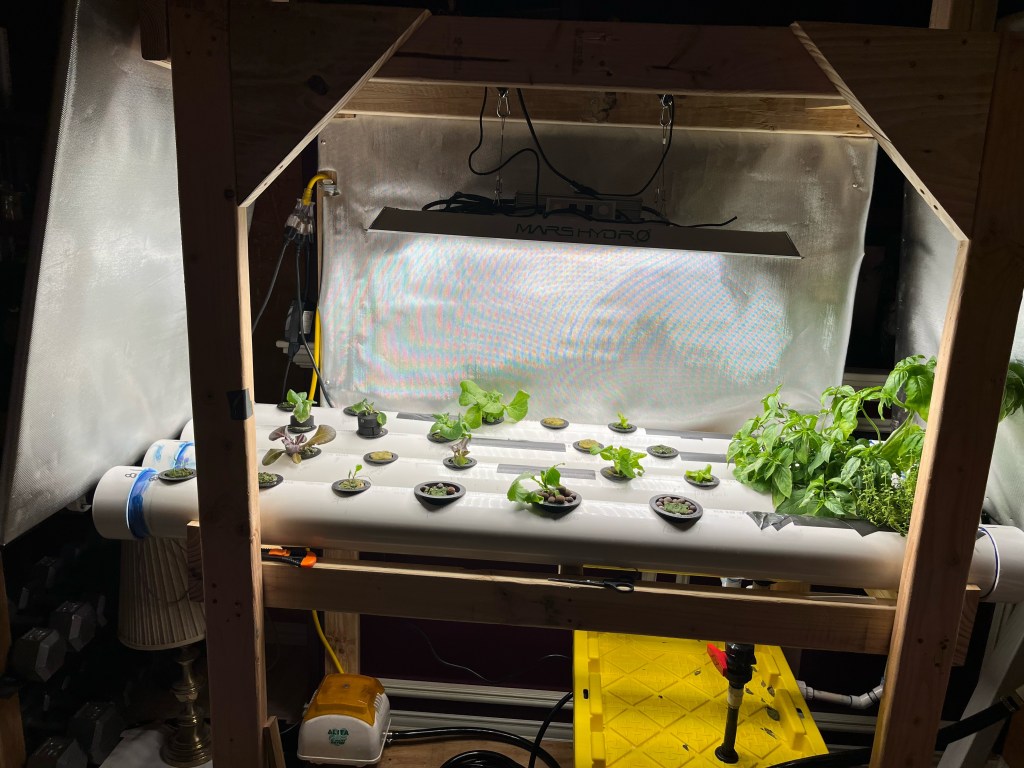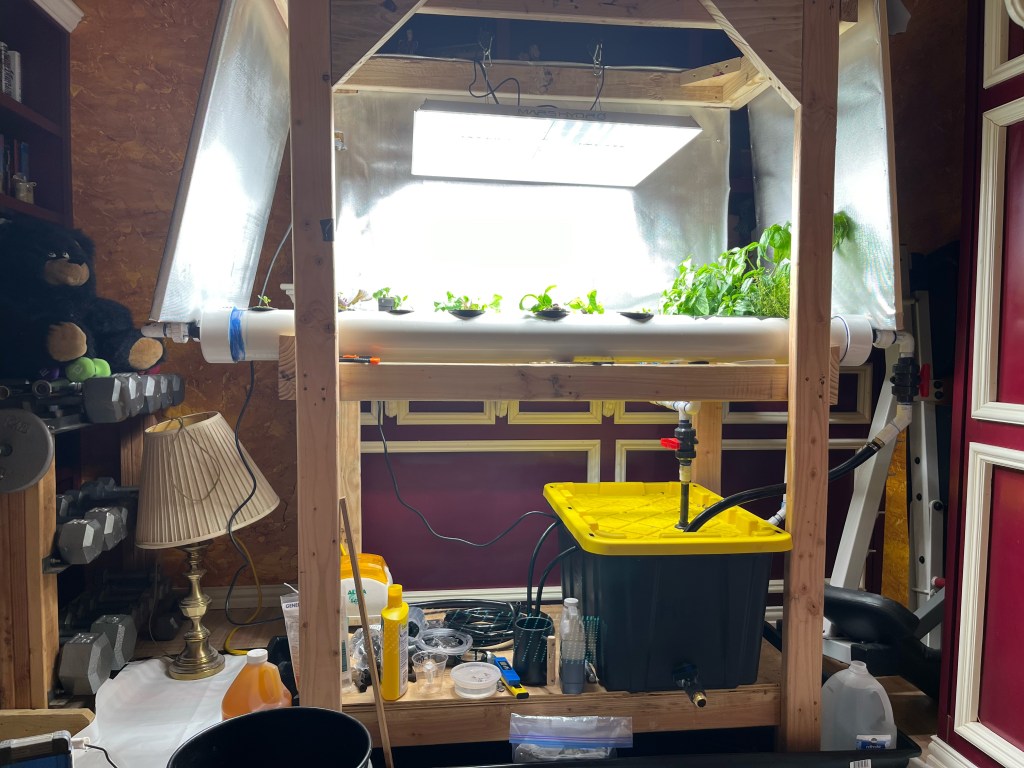 Howdy, howdy! How’s everyone doing this lovely Wednesday? Things here are fine so far. As promised, I have pictures of Dad’s hydroponics garden! The bigger plants off to the right are herbs he started in a tiny countertop version he bought. The dill is being ridiculous and showing off, but we don’t really know what to make with it aside from pickles and fish. So if you have a dill recipe, feel free to share it! The smaller plants are various lettuces, Chinese cabbage, bok choy, and probably stuff I’m forgetting. He’s thinking about adding tomatoes and peppers in the future. They’d have to be grown in buckets and need another light, but the pump should be able to handle them. So, yeah. Our spare bedroom is a garden now. Also, bonus pupper pics. Mardi needs a bath and Bonnie runs from the camera. Sophia is absent because she’s in her kennel since we weren’t supervising everyone (yes, she still randomly pees in the house). Anyway, I’ll be back next week with the usual book review!