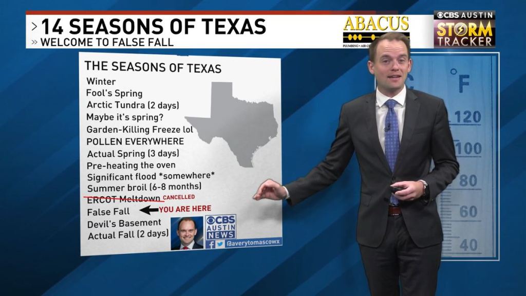 How can you tell it’s fall in Texas? People get excited over “cold fronts” that take us from 95 degrees down to 91. Or 89 if we’re really lucky. If it hits 85 degrees, people start pulling out the jeans and hoodies. People walk down the street holding their steaming pumpkin spice lattes, despite the fact that the asphalt is hotter than that coffee. Fall in Texas is weird.