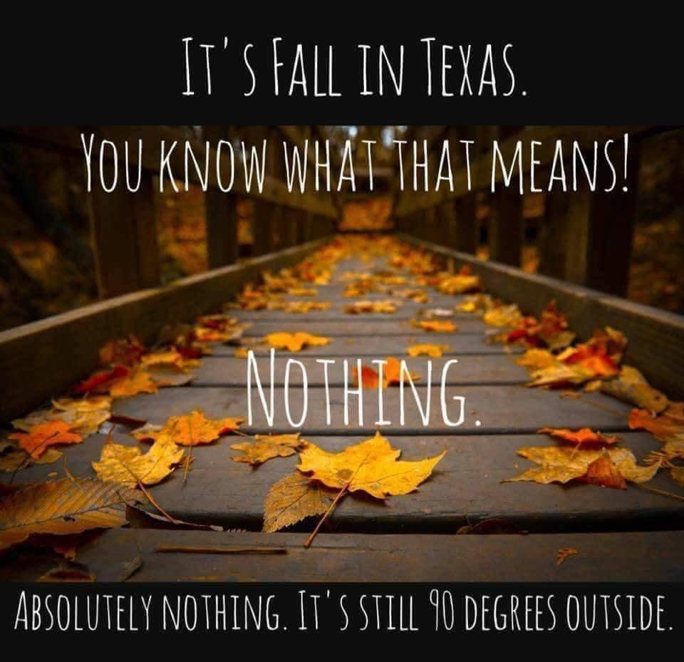 Oh, and don’t be fooled by the 3 days of nice weather at the end of September or beginning of October. That’s just Mother Nature screwing with us. We won’t get real fall until around Halloween, but that’s only for a week at best, then it’s winter. So, happy fall from Texas!