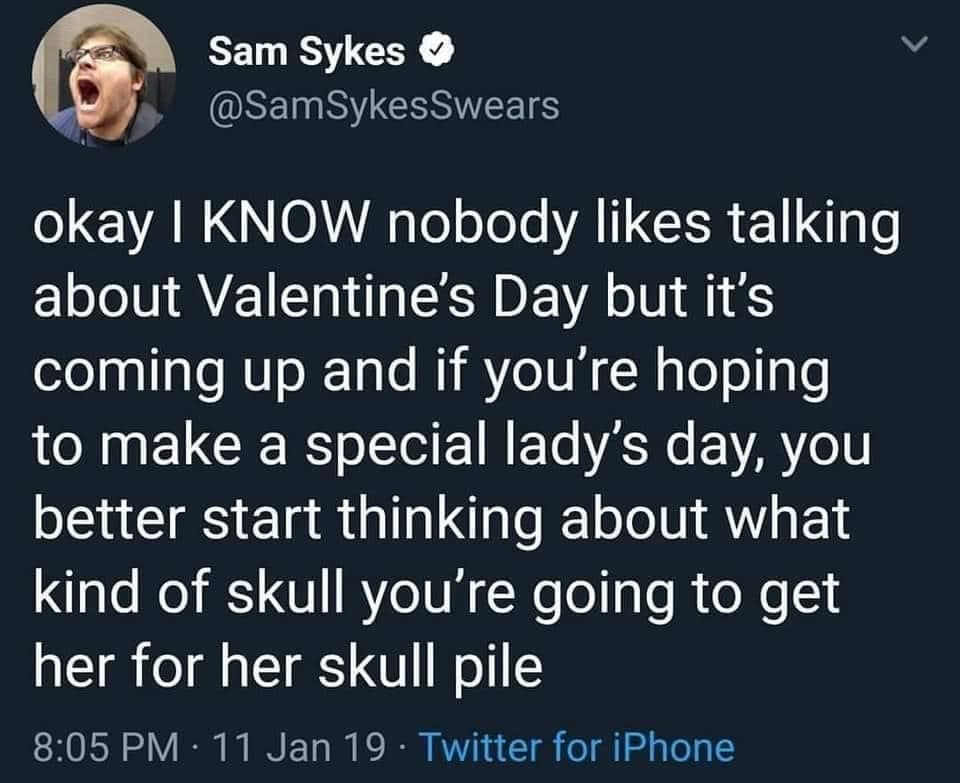 Just some ideas. Get your writer decaying corpses if that’s what they enjoy. Whatever floats their boat. Or your boat if you’re a writer pampering yourself. What kind of Valentine’s Day gifts do you prefer to receive and/or give? Feel free to leave your thoughts or questions or whatever here or on my social media pages!